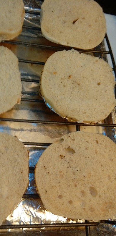 Cut bagels/muffins in half lengthwise and place onto rack.