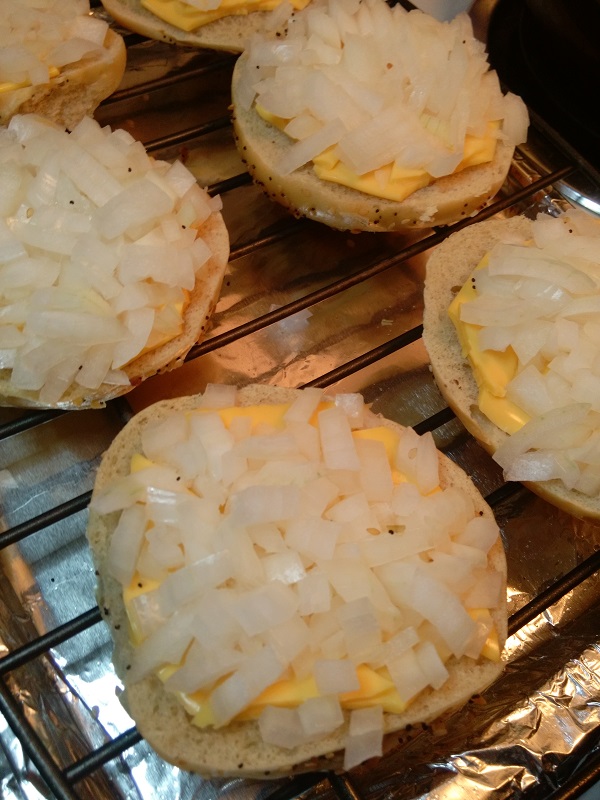 Specials are english muffins topped with american cheese, onions and bacon then broiled until bacon is crispy. The cheese melts into the bread as the bacon grease drips down, cooking the onions and imparting wonderful bacon flavor throughout the bread. The eating experience is impossible to describe, it’s just plain yummy. Over the years, many different meat, cheese and veggie combos have been tried and none have been as wildly delicious as the 3 basic toppings!