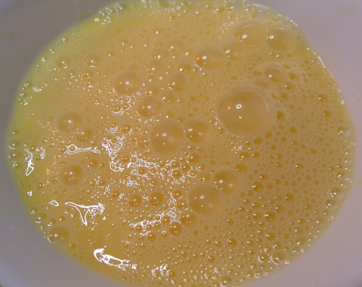 Quickly dump beaten eggs and flour mixture into the cheese mixture and STIR, STIR, STIR with a fork until completely combined.