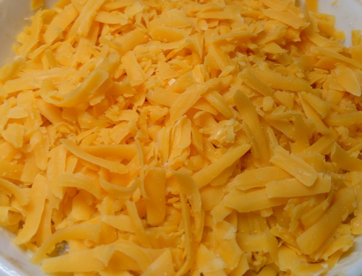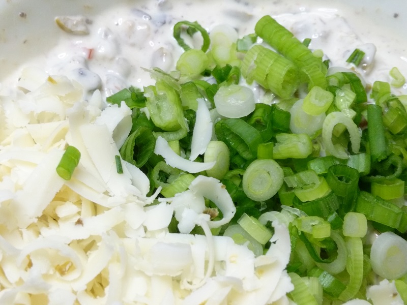 To the chopped olives, add mayo, sliced green onions (if desired) and half of the shredded cheese and stir to combine. Top with the remaining cheese. This time I used half pepperjack and half cheddar and it was delish!